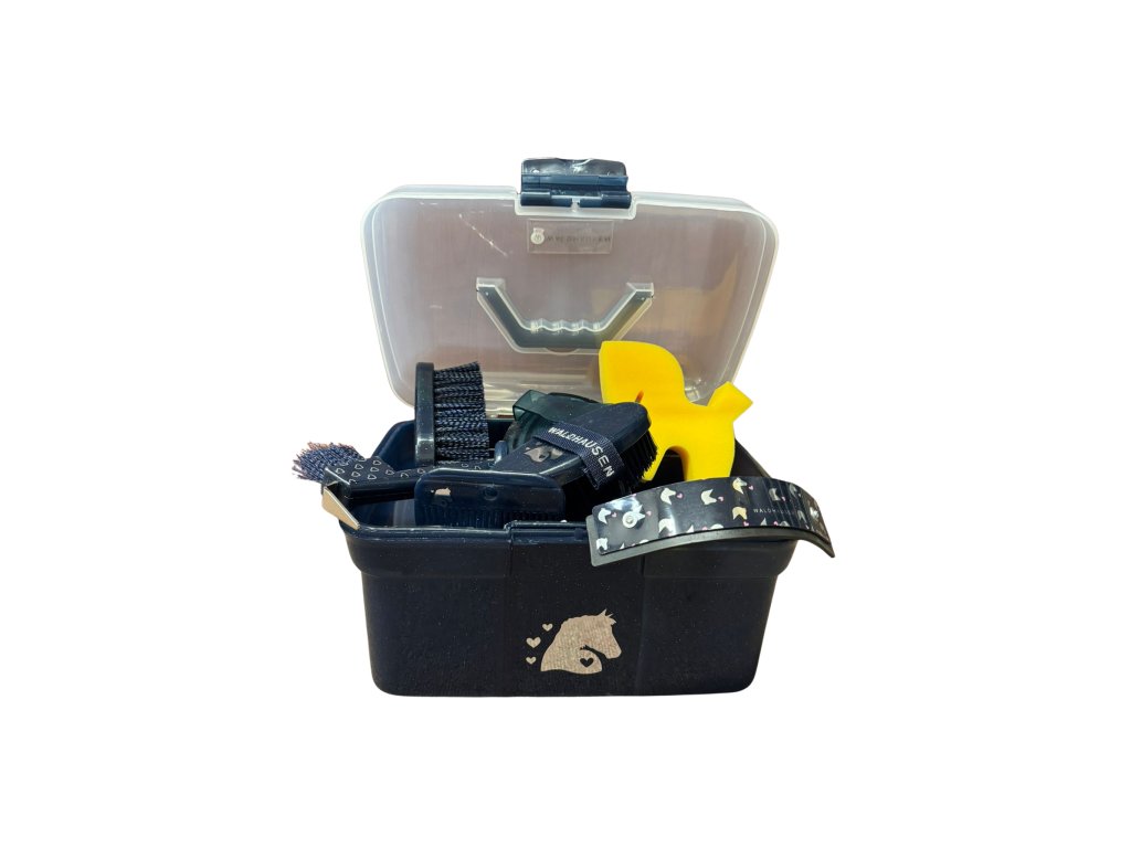 Táto modrá detská čistiaca sada Lucky je perfektným darčekom pre malých milovníkov koní. Puzdro s odnímateľnou priehradkou ponúka dostatok priestoru a organizáciu pre všetky potrebné nástroje na každodennú starostlivosť o koňa. Všetko je ladené do detskej kolekcie Lucky, ktorá je nielen praktická, ale aj hravá a farebná.