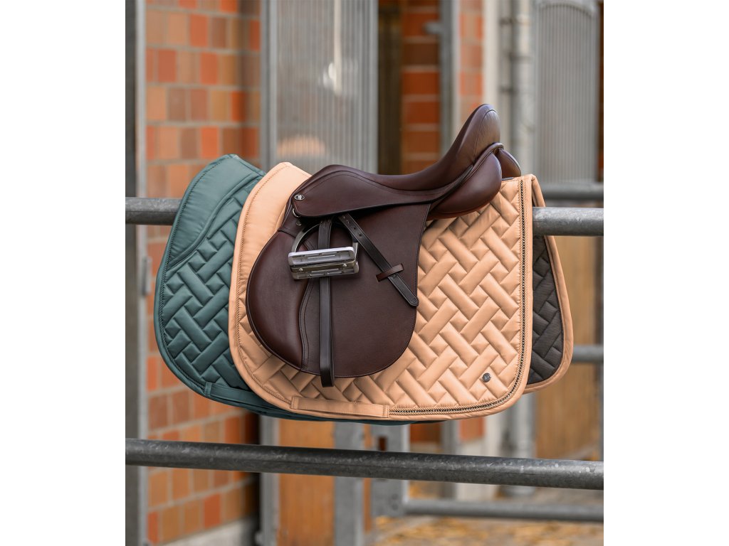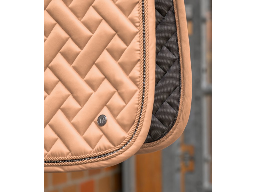 Luxusná drezúrna podsedlová podložka Turin v jemnom odtieni peach spája moderný dizajn s vysokou funkčnosťou. Vrchný materiál s elegantným leskom dopĺňa podšívka z bambusových a polyesterových vlákien, ktorá výborne reguluje vlhkosť a pomáha udržiavať chrbát koňa suchý aj pri intenzívnom tréningu.