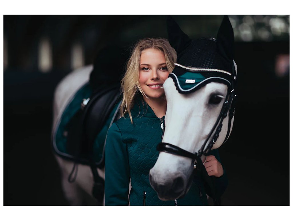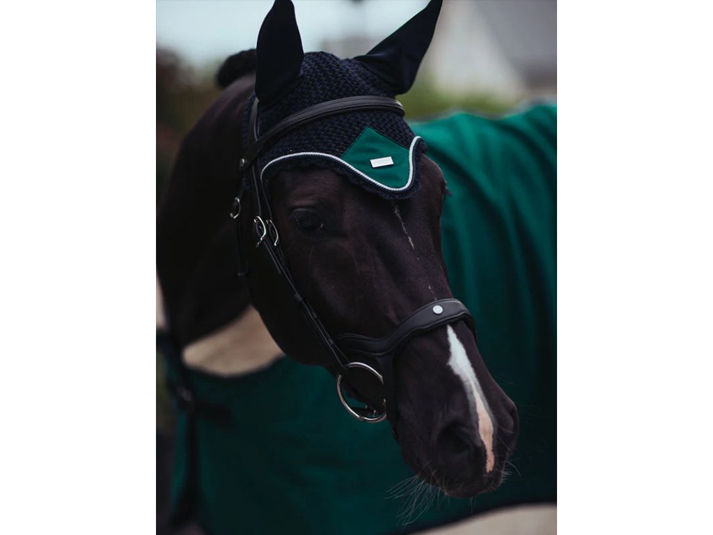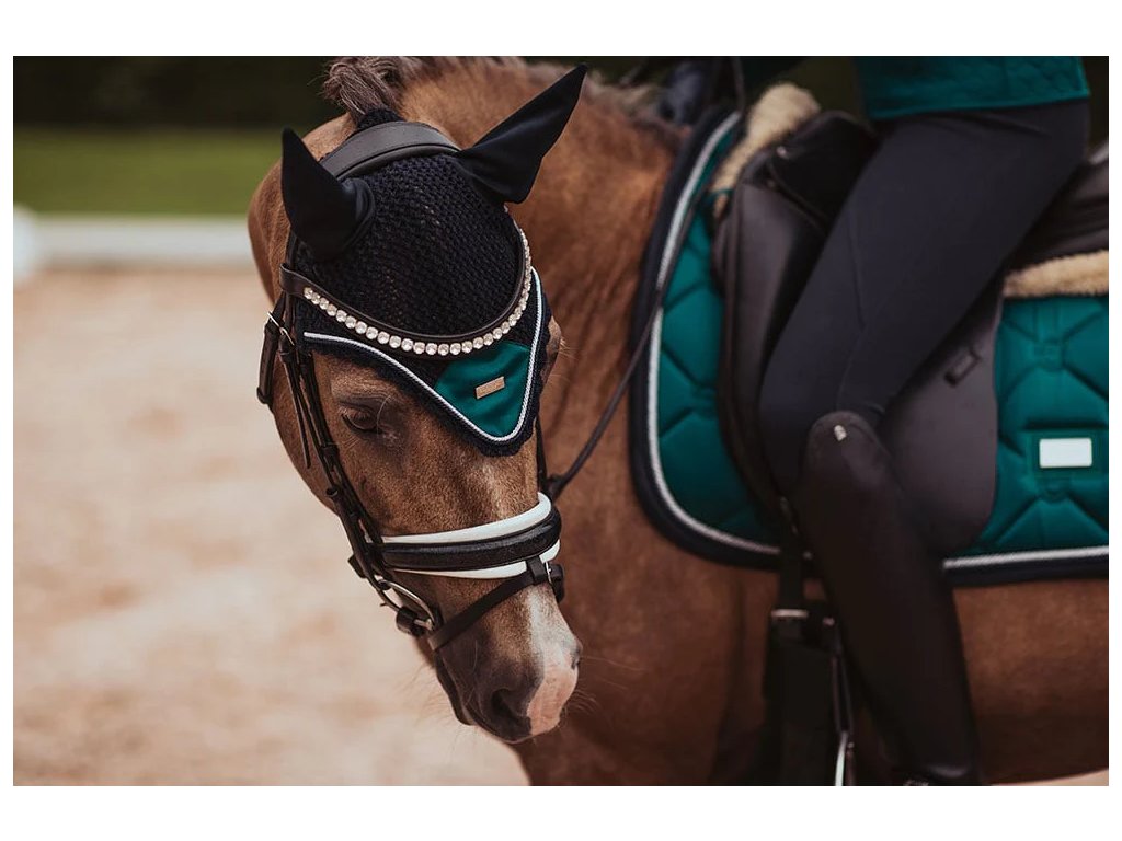 Equestrian Stockholm ušaňa Emerald Navy je exkluzívna háčkovaná ušaňa, ktorá vyniká elegantnou kombináciou tmavomodrej (navy) a výrazných emerald zelených detailov. Je ideálnou voľbou pre jazdcov, ktorí chcú spojiť štýlový vzhľad koňa s funkčnými vlastnosťami počas tréningu aj pretekov.