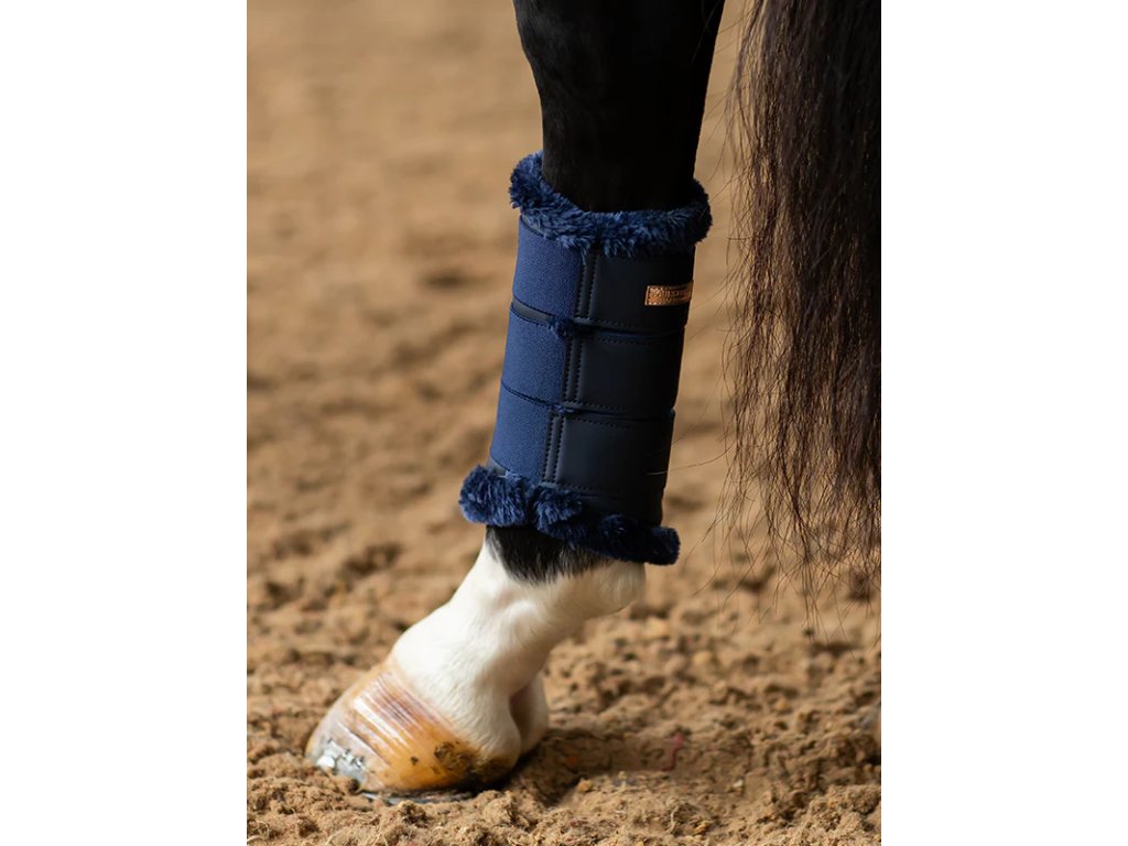 Equestrian Stockholm Lagoon Blush gamaše sú navrhnuté pre maximálnu ochranu a pohodlie koňa. Vyrobené zo syntetickej PU kože s elegantným matným povrchom v štýlovom modrom odtieni. Vnútro tvorí mäkká teddy podšívka, ktorá chráni nohy pred odermi a poskytuje komfort aj pri intenzívnej práci.