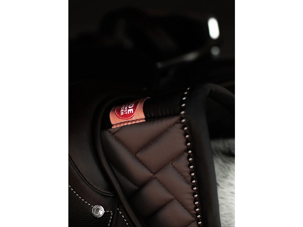 Skoková podsedlová podložka Equestrian Stockholm Modern Mocha spája moderný dizajn a funkčnosť. Vyhotovená v štýlovej moka hnedej s čiernym lemom, ozdobená perlami tón v tóne a čiernym kovovým odznakom Equestrian Stockholm.