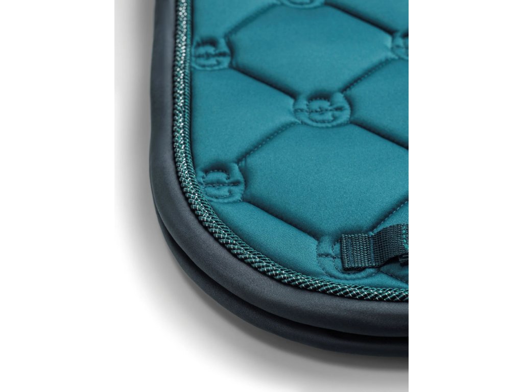 Drezúrna verzia podložky z kolekcie Equestrian Stockholm Teal Blue je navrhnutá pre jazdcov, ktorí chcú spojiť štýl a maximálne pohodlie. Saténový povrch v sýtom teal odtieni dodáva podložke exkluzívny vzhľad, zatiaľ čo tmavé lemovanie a výšivka loga podčiarkujú celkovú eleganciu. Anatomický tvar sa dokonale prispôsobí tvaru drezúrneho sedla a vnútorná výplň z priedušného materiálu zabezpečuje optimálne podmienky pre chrbát koňa počas každej jazdy.