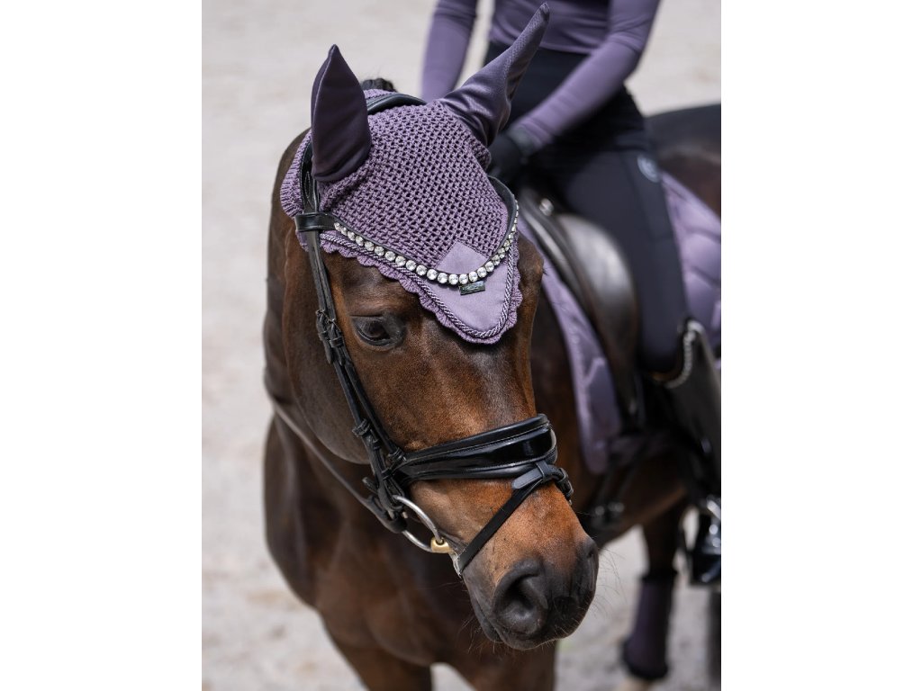 Táto ušaňa z kolekcie Dark Violet od Equestrian Stockholm je dokonalým spojením funkčnosti a štýlu. Saténové uši efektívne tlmia okolitý hluk, čo prispieva k väčšiemu pokoju a sústredenosti koňa počas jazdy. Háčkovaná predná časť zabezpečuje ventiláciu a zároveň slúži ako spoľahlivá ochrana pred hmyzom. Jednotný tmavofialový dizajn s decentným lesklým lemovaním dokonale ladí s podsedlovou podložkou z rovnakej kolekcie.