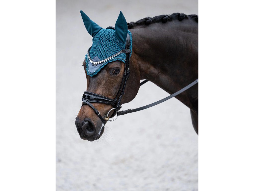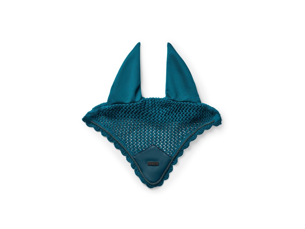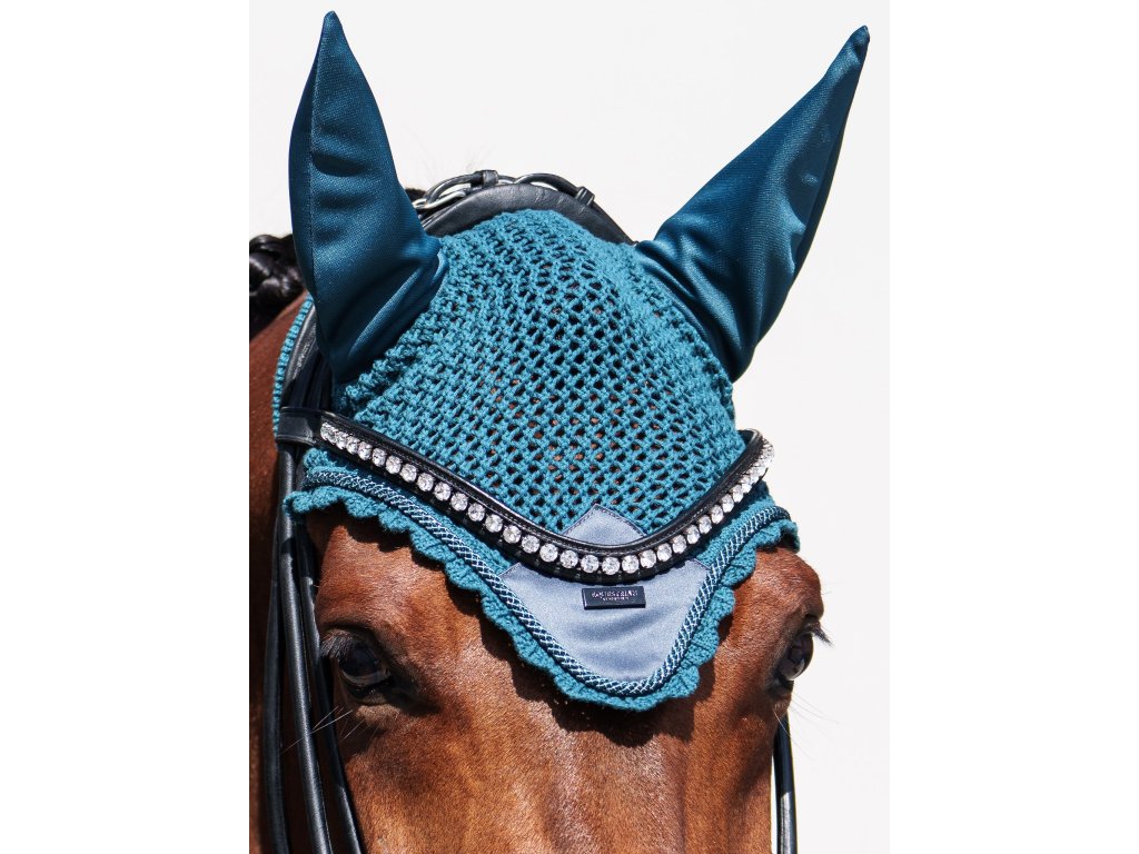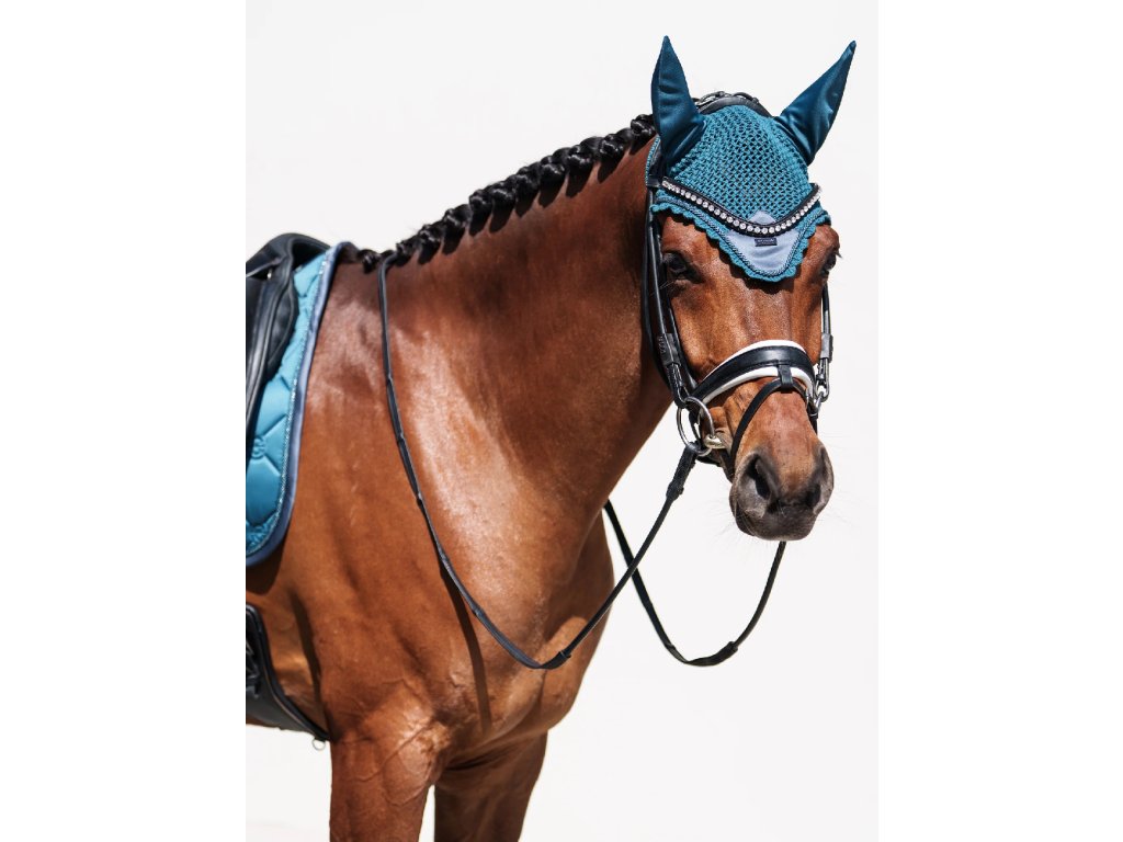 Ušaňa z kolekcie Equestrian Stockholm Teal Blue je elegantným a funkčným doplnkom pre každého koňa. Saténové uši tlmia rušivé zvuky a zvyšujú koncentráciu počas jazdy, zatiaľ čo háčkovaná predná časť poskytuje výbornú ventiláciu a ochranu pred hmyzom. Celkový dizajn v sýtej modrozelenkavej farbe (Teal Blue) dopĺňa decentné lemovanie a detailné spracovanie, ktoré z nej robia ideálny doplnok k rovnakej podsedlovej podložke.