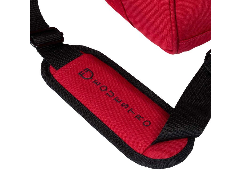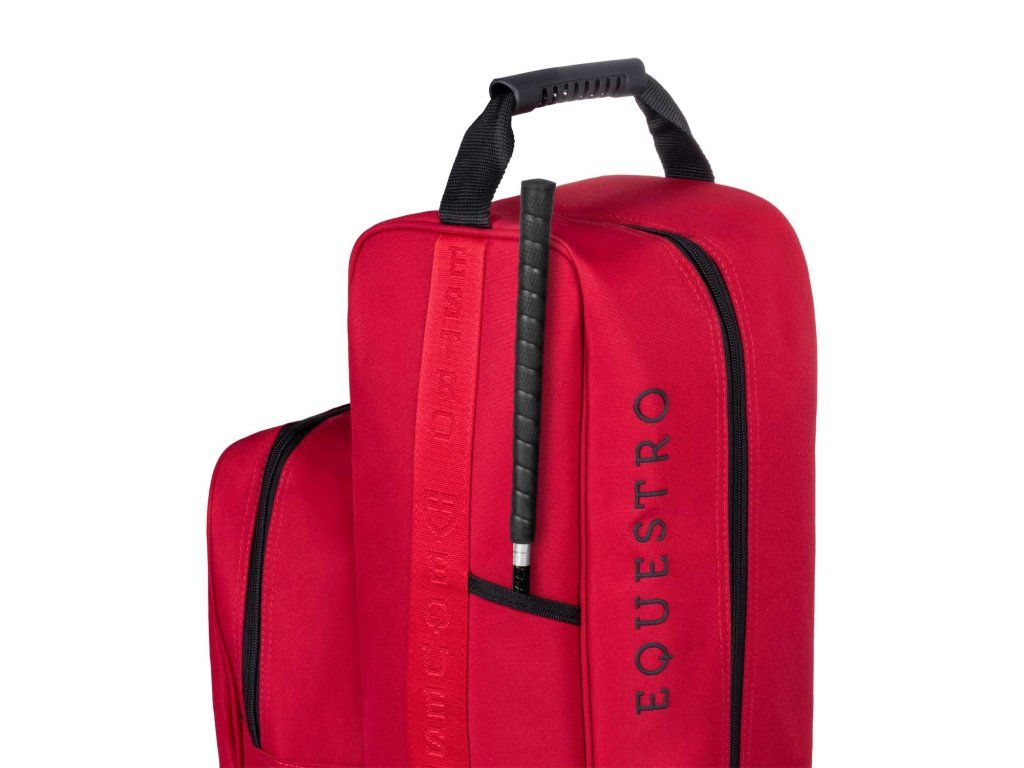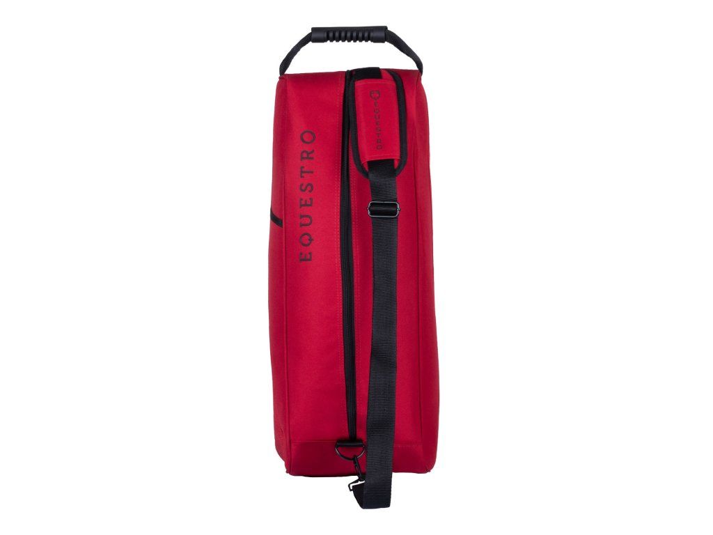 Pri prenášaní oceníte nylonové držadlo aj nastaviteľný ramenný popruh, ktoré zabezpečujú pohodlný transport. Komfort pri používaní zvyšujú aj vetracie otvory, ktoré podporujú cirkuláciu vzduchu, a bočné úložné vrecko na drobnosti alebo jazdecké príslušenstvo. Celkový vzhľad dotvára silikónové logo na prednej strane a nápis Equestro na popruhu, vďaka čomu má taška elegantný, športový a reprezentatívny charakter.