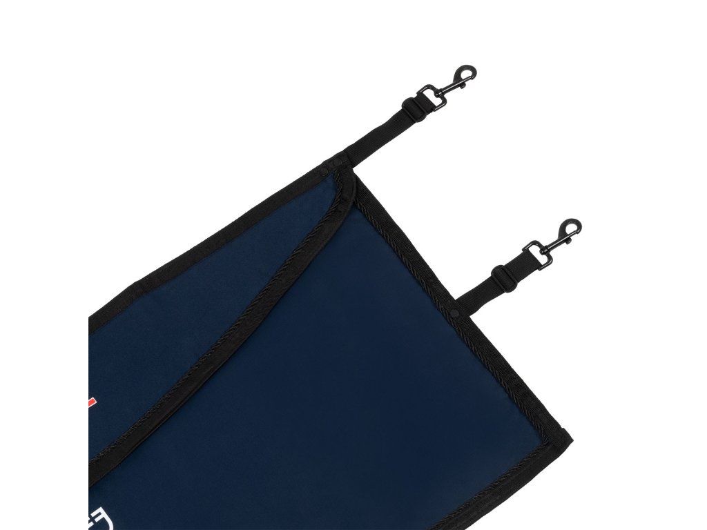 Na koncoch popruhov sa nachádzajú oceľové karabíny, ktoré zabezpečujú pevné a dlhodobé uchytenie. Výsledkom je bezpečné a stabilné riešenie, ktoré pomáha vytvoriť koňovi pokojný priestor a zároveň pôsobí profesionálne. Vzhľad produktu dopĺňa vyšívané logo Equestro X FISE a nápis Equestro Italia, ktoré dodávajú zástene prémiový športovo-elegantný charakter.