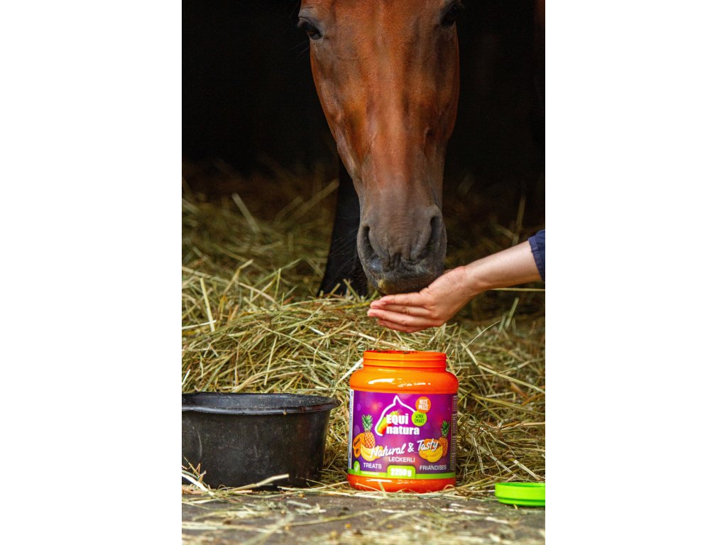 Maškrta, ktorou poviete „ďakujem“ po každom peknom kroku. Prírodné maškrty EQUINATURA Banán/Ananás/Papája sú chutné a výživné, s kúskami banánu, ananásu a papáje, ktoré dodajú tropickú iskru. Vyrábané zodpovedne v Nemecku, chrumkajú, voňajú a kone ich milujú – ideálne na tréning, po práci aj na zblíženie v boxe.