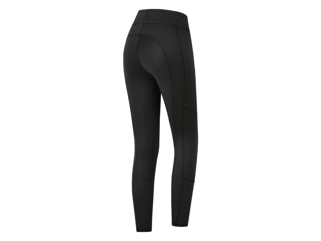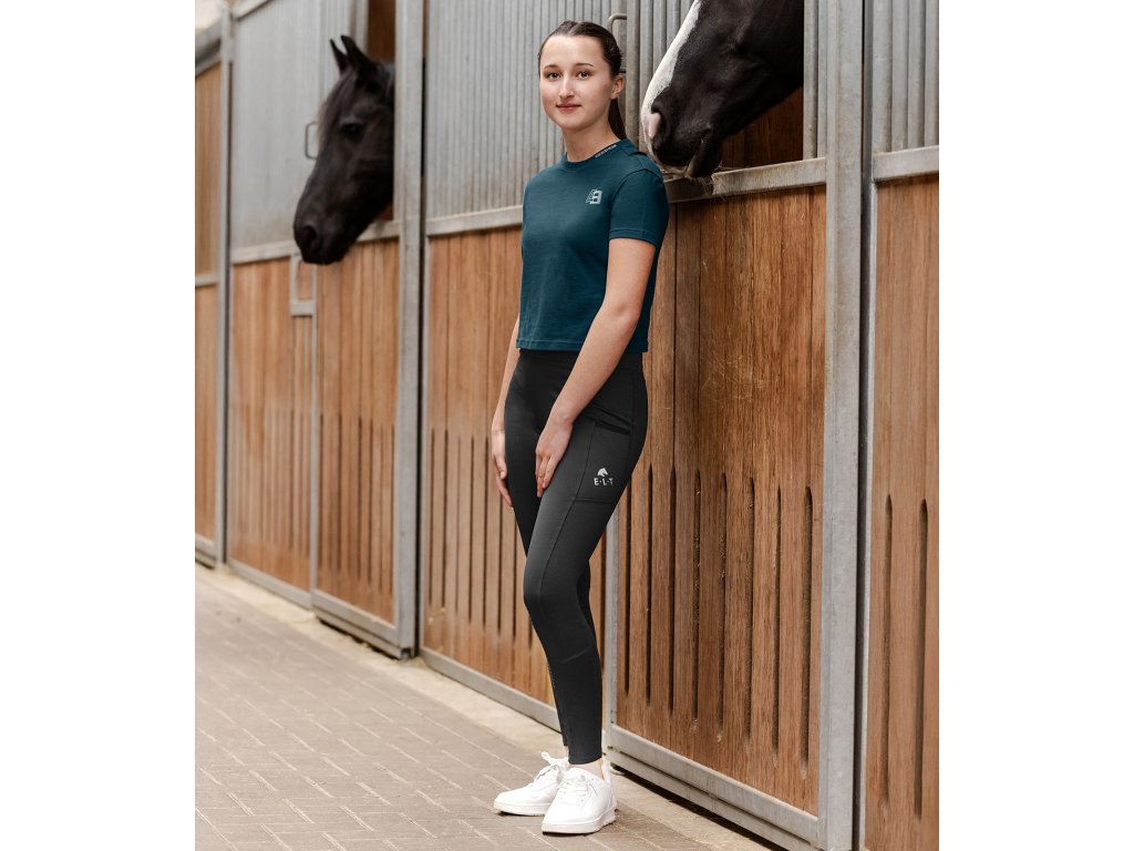 Pohodlné jazdecké legíny E·L·T Ella v čiernej farbe s celoplošným silikónovým gripom, bi-elastickým priedušným materiálom a praktickými vreckami na mobil pre maximálny komfort v sedle.