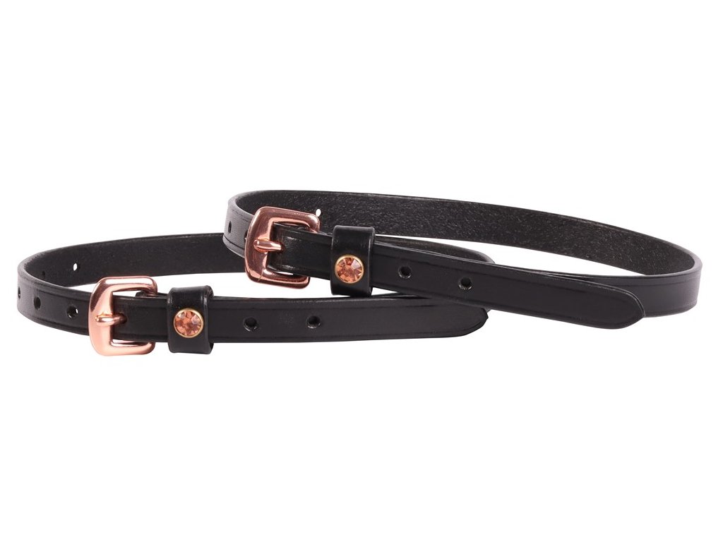 Remienok je vyrobený z pevnej, hladkej kože, ktorá dobre drží tvar a zároveň sa prispôsobí člen jazdca. Pracka v ružovo-zlatom tóne dodáva výnimočný vzhľad, ktorý výborne ladí so šporňami v podobnom štýle. Ideálny doplnok pre súťažné aj každodenné jazdenie.
