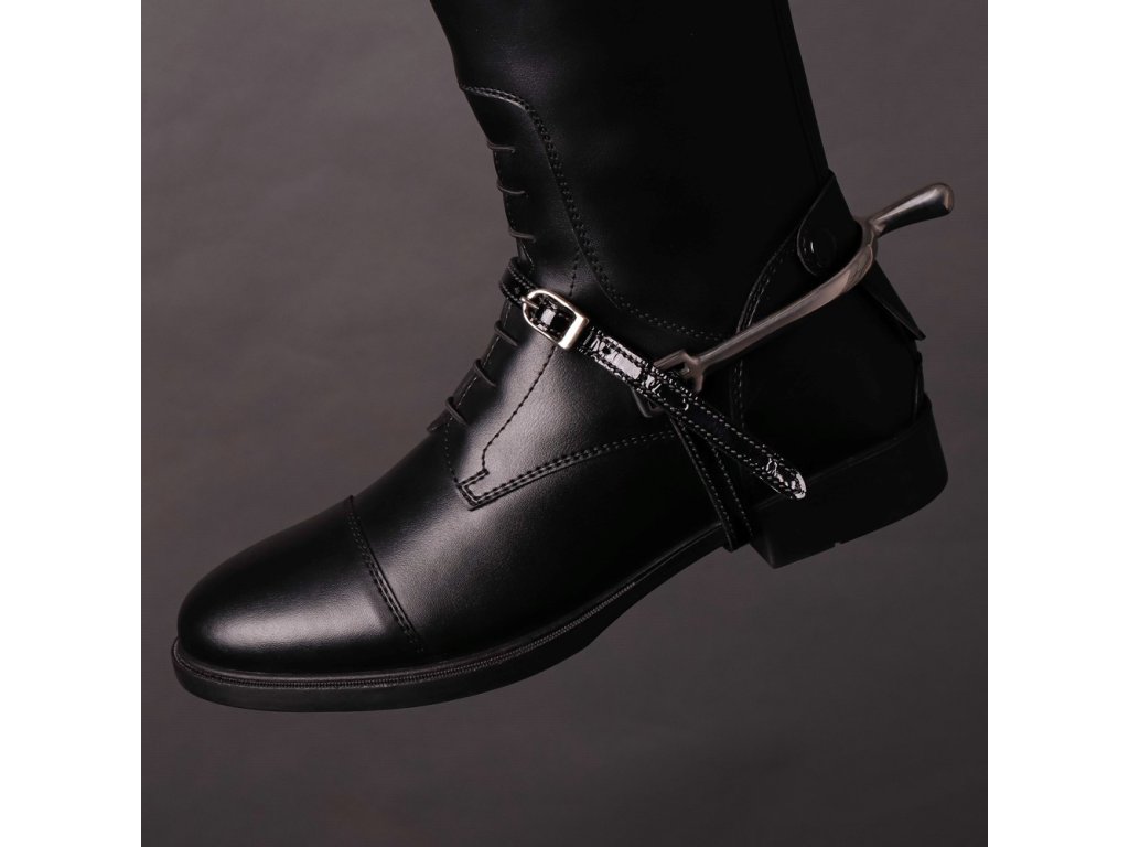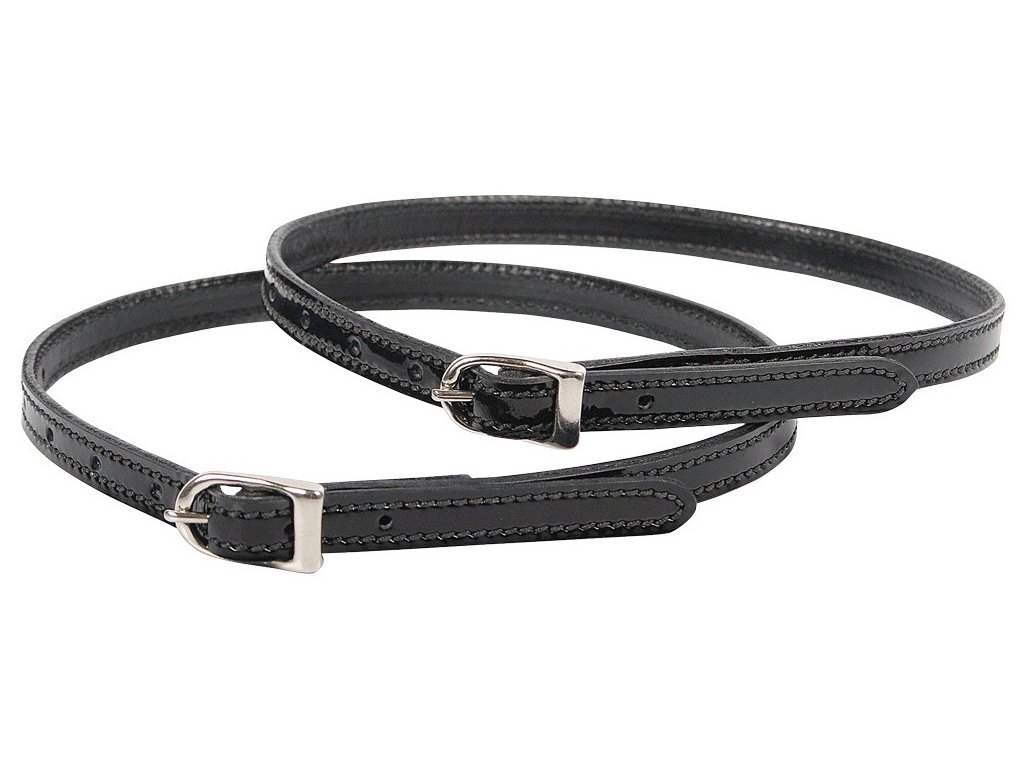 Tieto lakované remienky k ostrohám v čiernej farbe sú dokonalým doplnkom pre každého jazdca, ktorý hľadá eleganciu, funkčnosť a kvalitu. Vyrobené z odolnej lakovanej kože, doplnené o úzky kovový uzáver pre presné nastavenie a bezpečné upevnenie ostrohy.