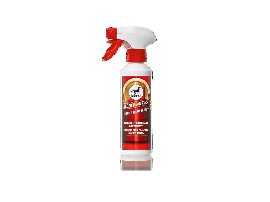 Leovet Leder Ruck Zuck je ideálnym pomocníkom pre rýchle čistenie a ošetrovanie všetkých hladkých kožených výrobkov. Kombinuje účinnosť sedlovej mydla a výživného koženého tuku v jednom praktickom spreji. Koža zostáva jemná, pružná a chránená pred vysušením.