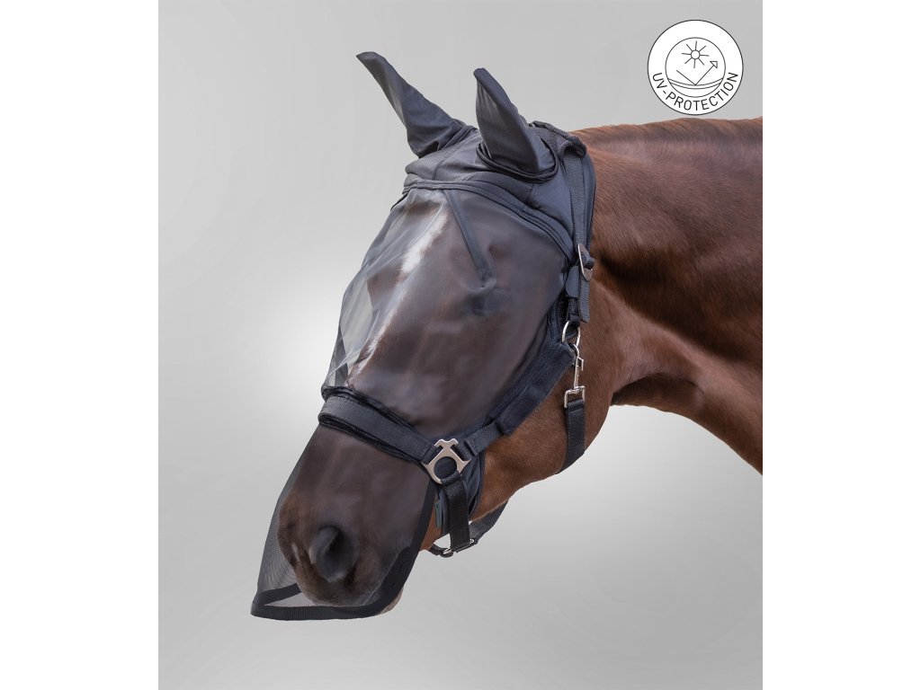 Nosový pás je elastický a individuálne nastaviteľný, takže sa maska lepšie prispôsobí hlave koňa. Ochrana uší a nosa pomáha chrániť najcitlivejšie časti hlavy pred hmyzom.