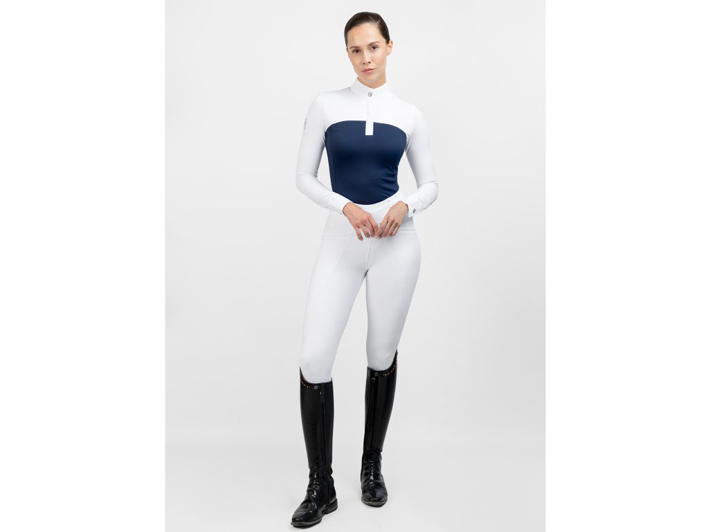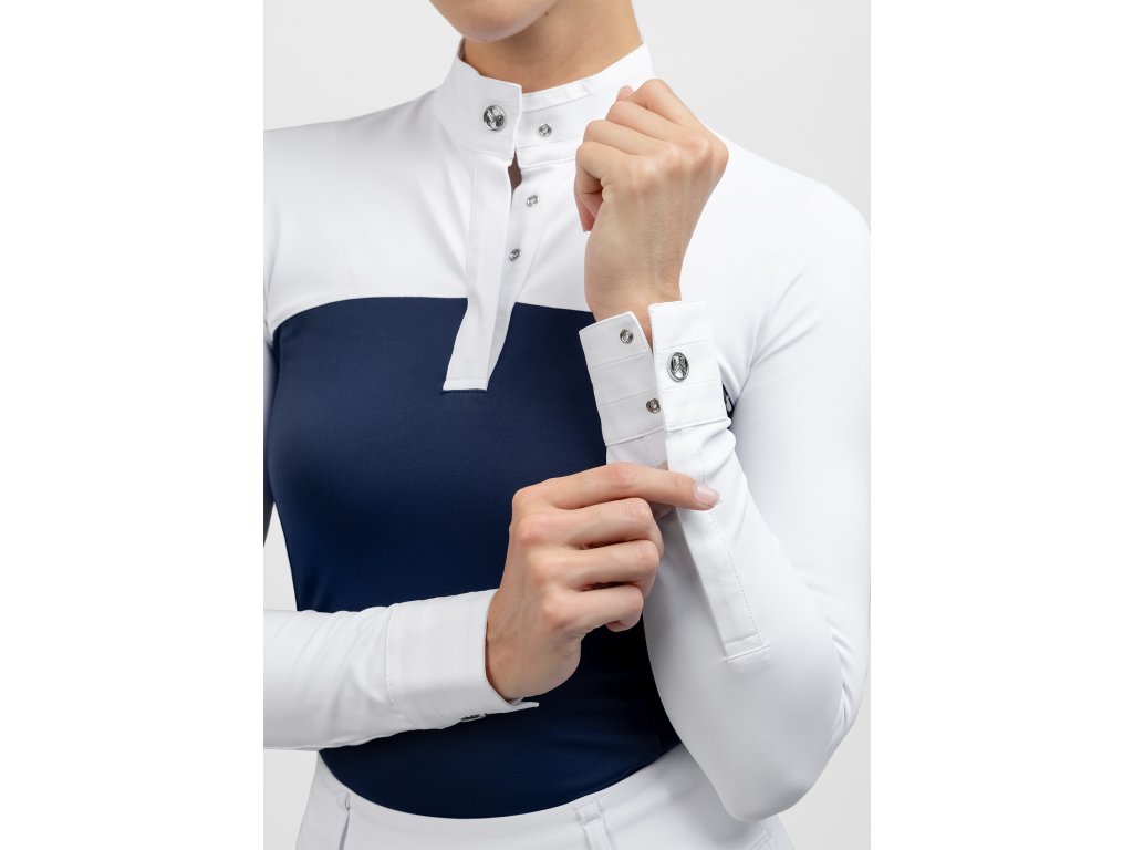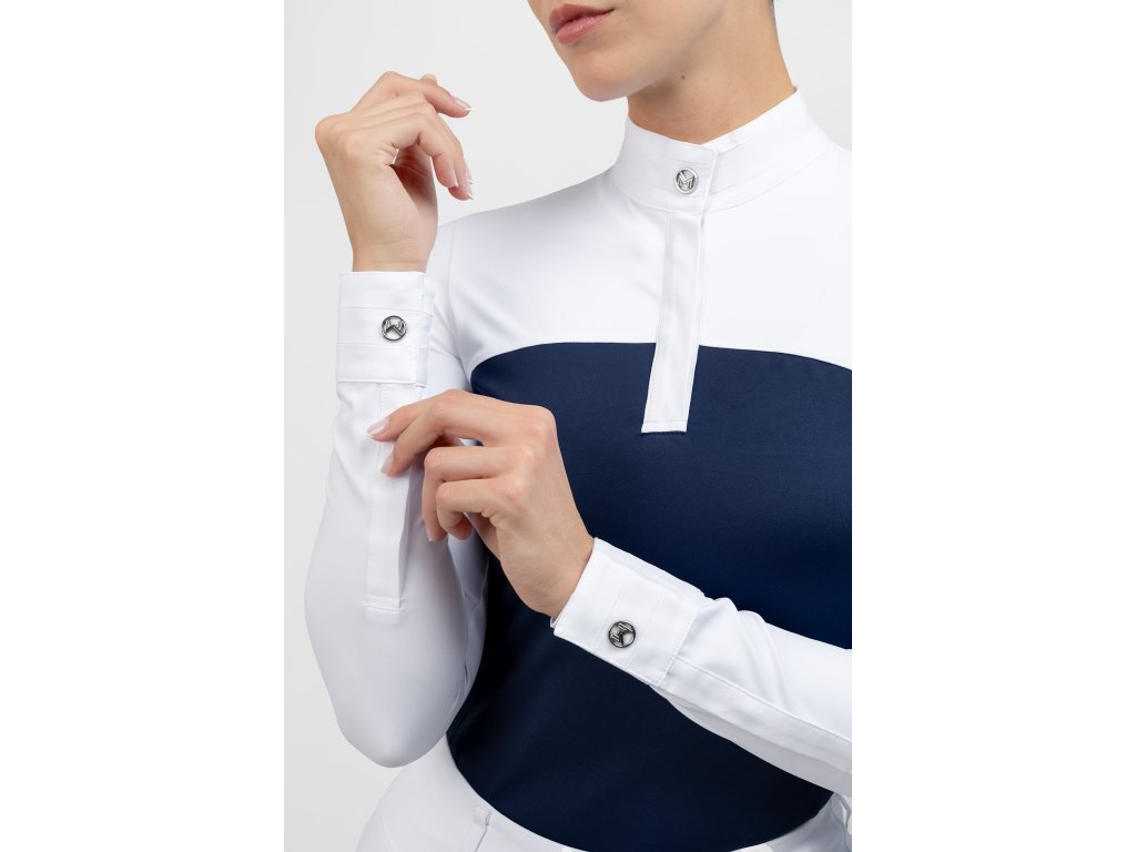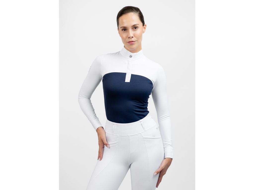 Era Long Sleeve Show Shirt – Navy je ideálnou voľbou pre jazdcov, ktorí chcú kombináciu klasickej elegancie, technickej funkčnosti a celodenného komfortu na súťažnom kolbisku.