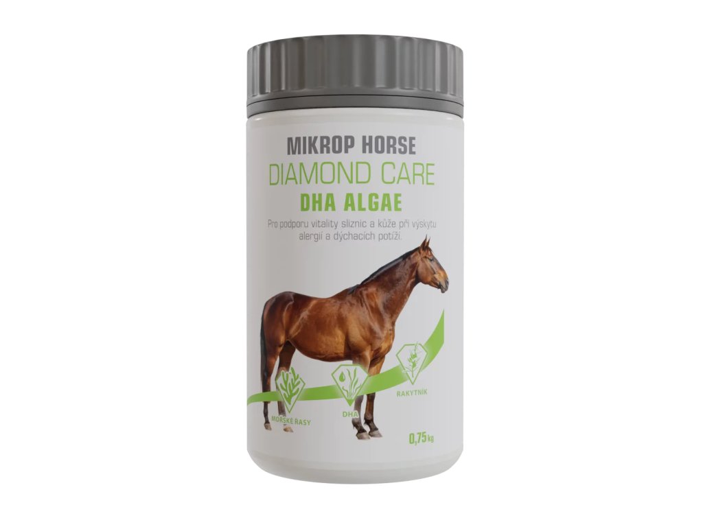 Mikrop® Horse Diamond Care DHA Algae je doplnkové krmivo pre kone so žalúdočnými vredmi, alergiami, problémami dýchacieho aparátu, pre kone vo vysokej pracovnej záťaži, ale aj pre chovné kone (po dohode s veterinárom). Obsahuje prírodnú DHA (kyselina dokosahexaenová, omega-3) z morských rias na podporu imunitnej sústavy, vitality kože, slizníc, pohybového a dýchacieho aparátu.