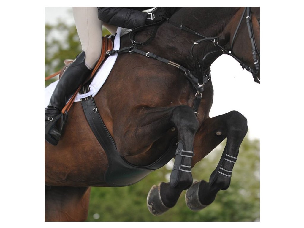 Bezpečnostný pás „Secure X“ umožňuje, aby náprsník tesne priliehal k hrudníku koňa, čím zabraňuje zaháknutiu koňa a predchádza vážnym nehodám.