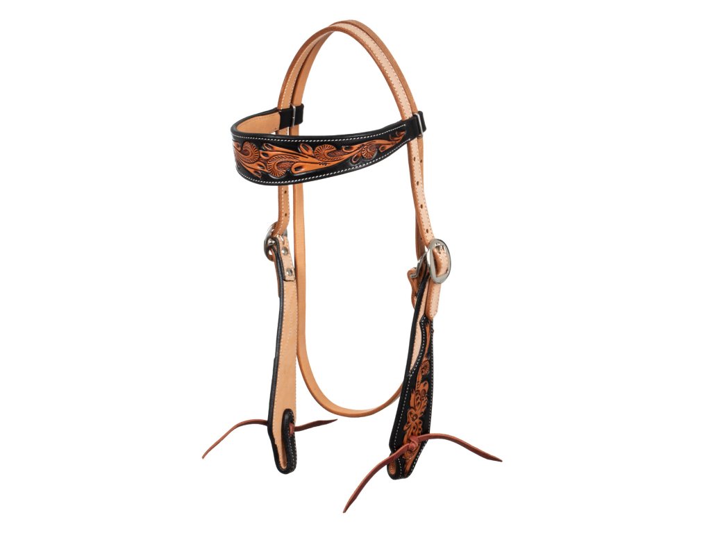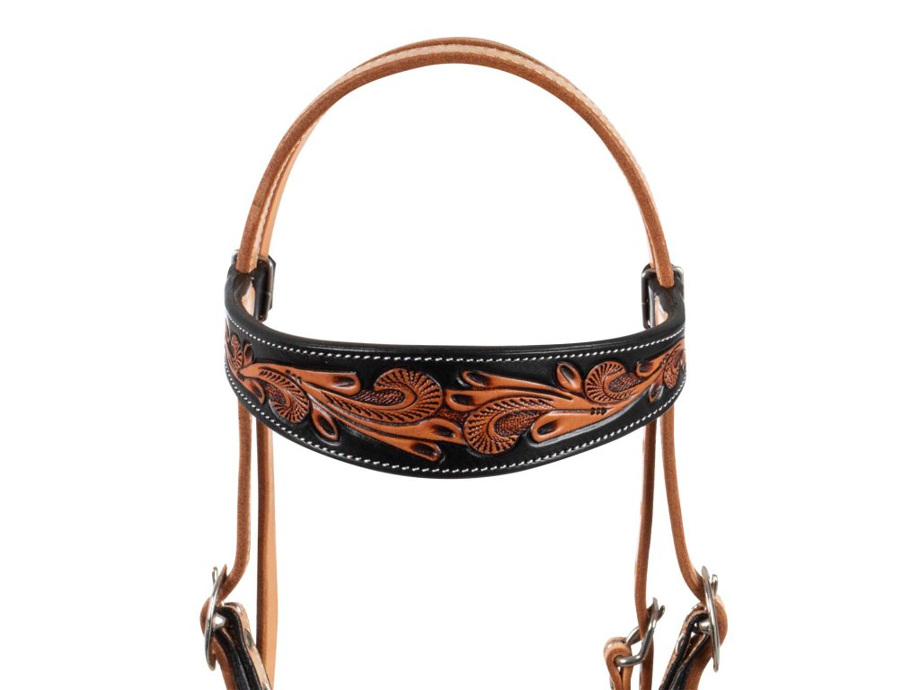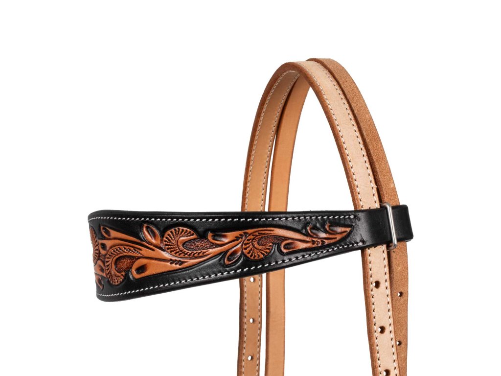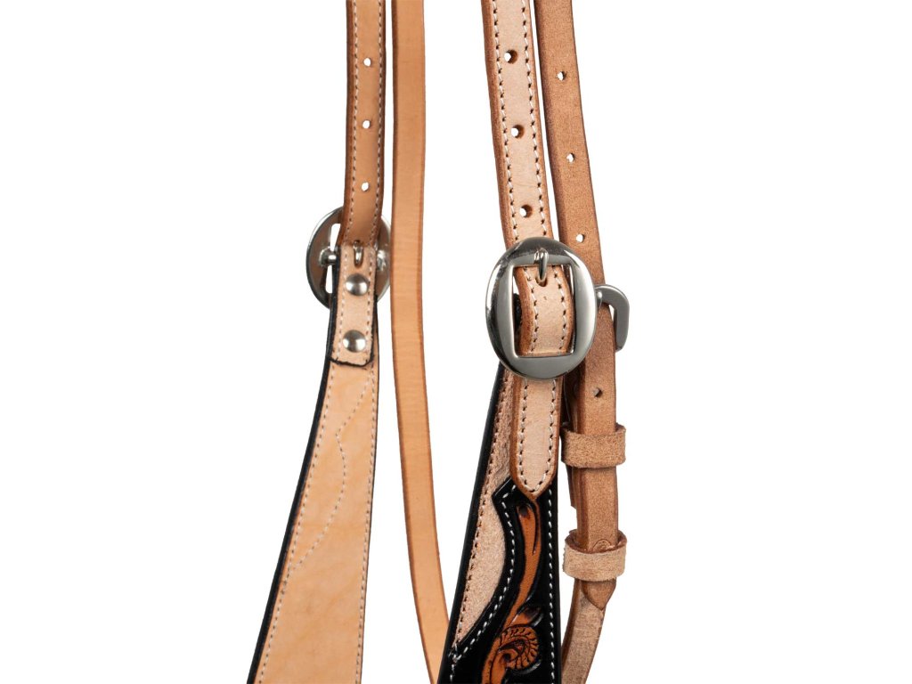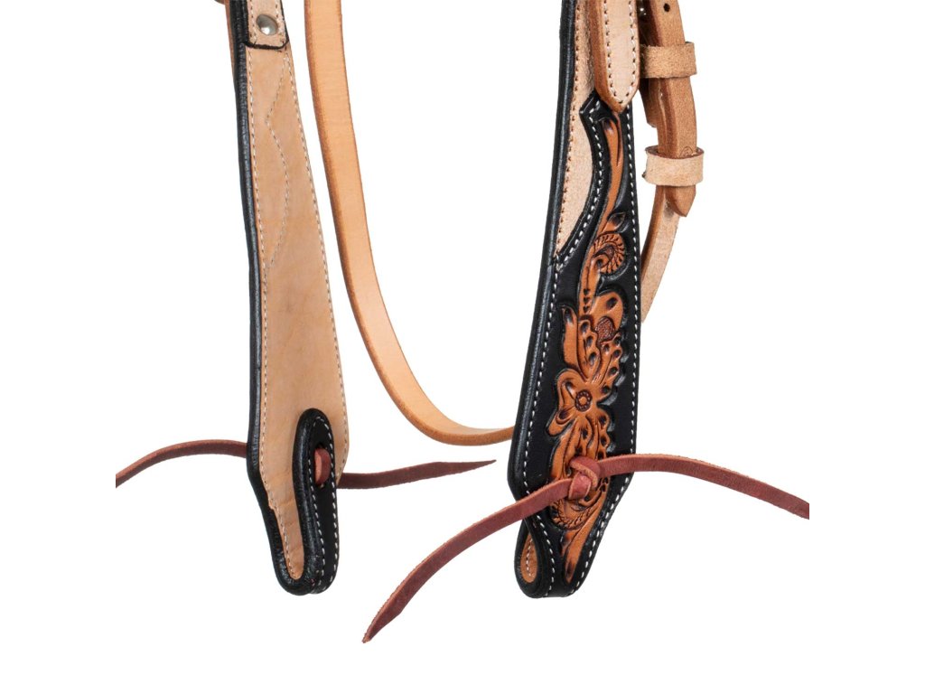 Kožená westernová uzdečka Pool's Western Bridle Dark Floral Tooling spája tradičné remeselné spracovanie s výrazným dizajnom. Vyrobená z prvotriednej hovädzej kože v prírodnom odtieni, doplnená ručne vyrezávaným kvetinovým vzorom v tmavom prevedení, ktorý je orámovaný čiernym kontrastným lemom so svetlým šitím.