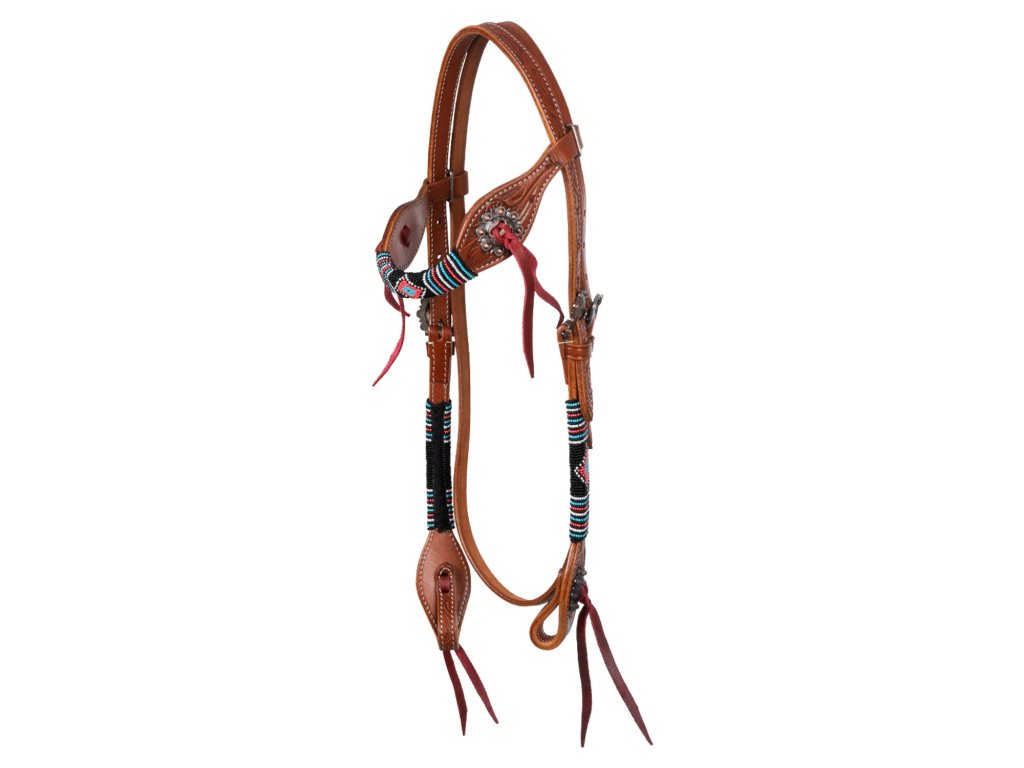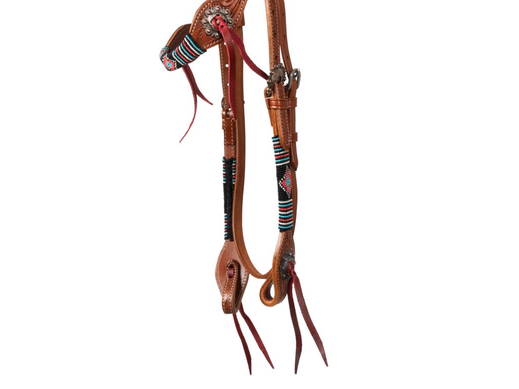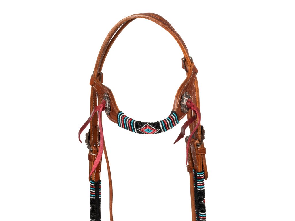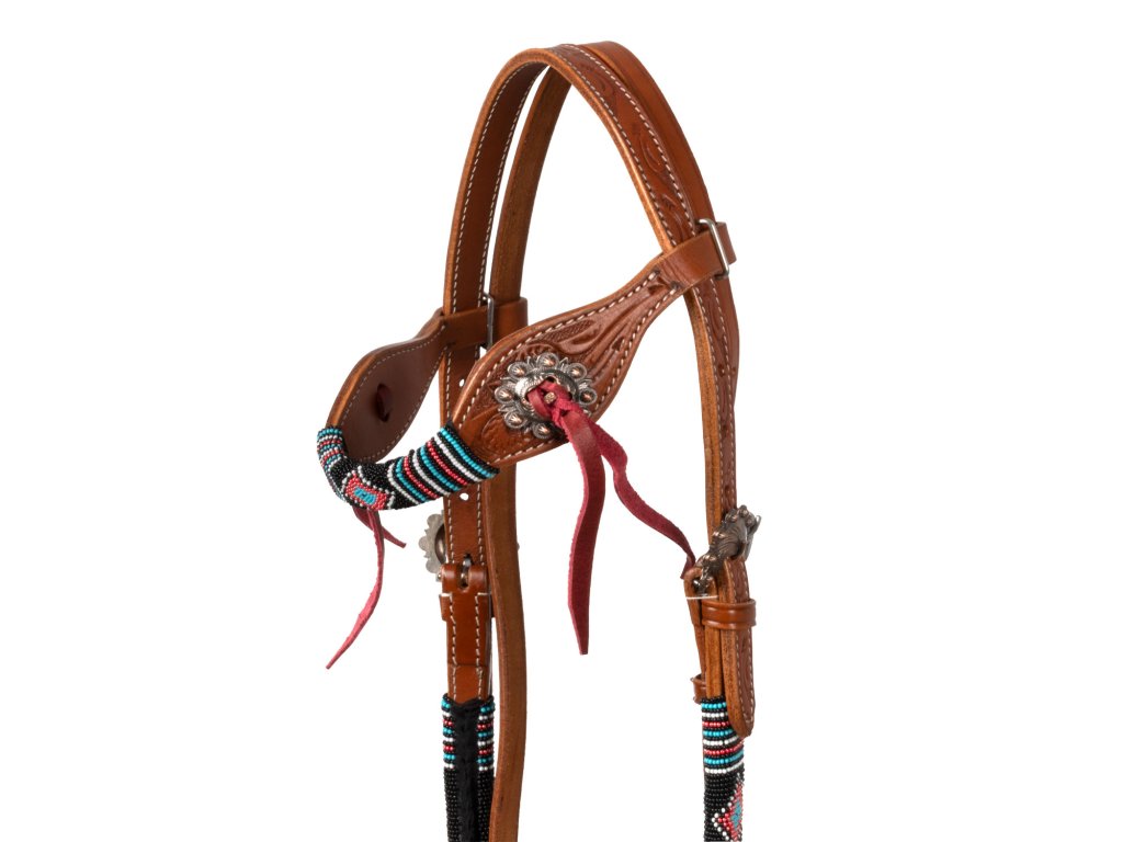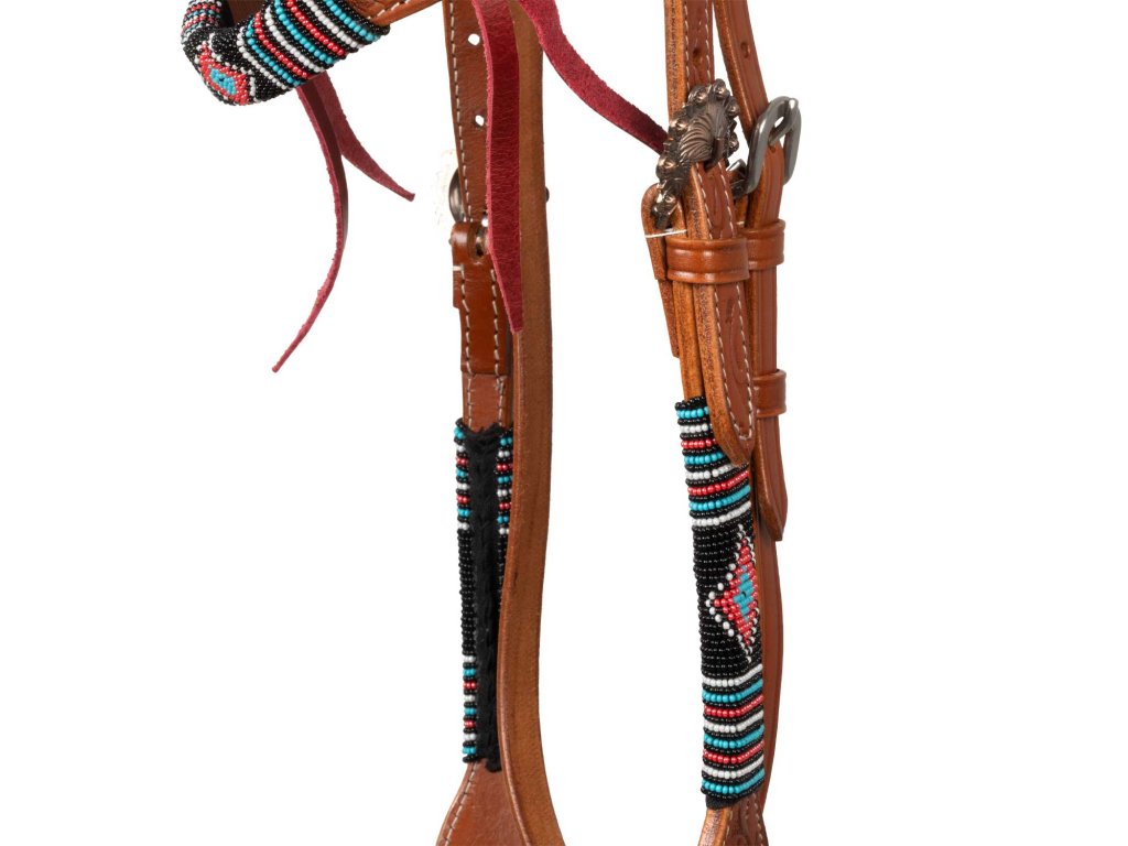Výrazným dizajnovým prvkom sú čiernej korálkové aplikácie v kombinácii, bielej, zelenej a červenej, ktoré dodávajú uzdečke autentický westernový charakter. Korálky sú pevne zapracované do kože a umiestnené na strategických miestach, aby pri jazde pôsobili dekoratívne aj funkčne.