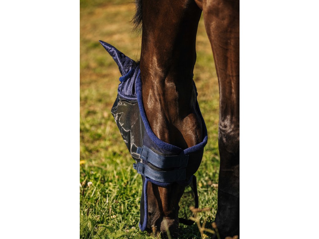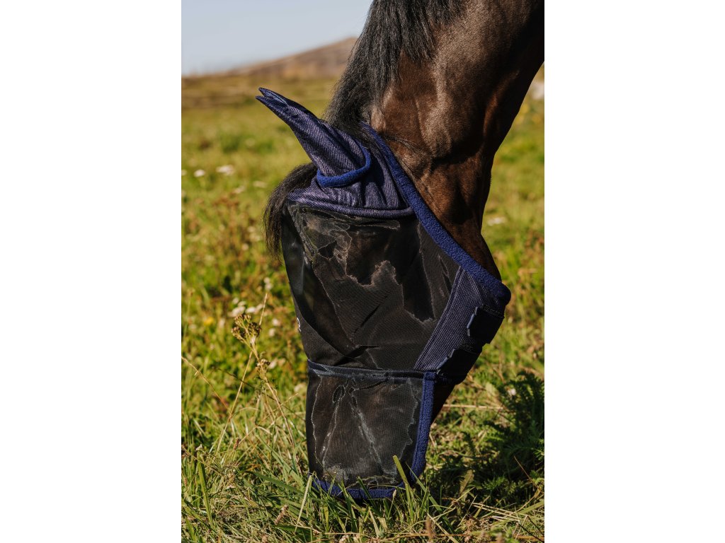 Maska proti hmyzu RIDING WORLD First v tmavomodrej farbe je nevyhnutným doplnkom pre ochranu koňa počas sezóny hmyzu. Vďaka jemnej sieťovine poskytuje maximálnu priedušnosť a zároveň chráni pred nebezpečnými UV lúčmi s faktorom 50+.