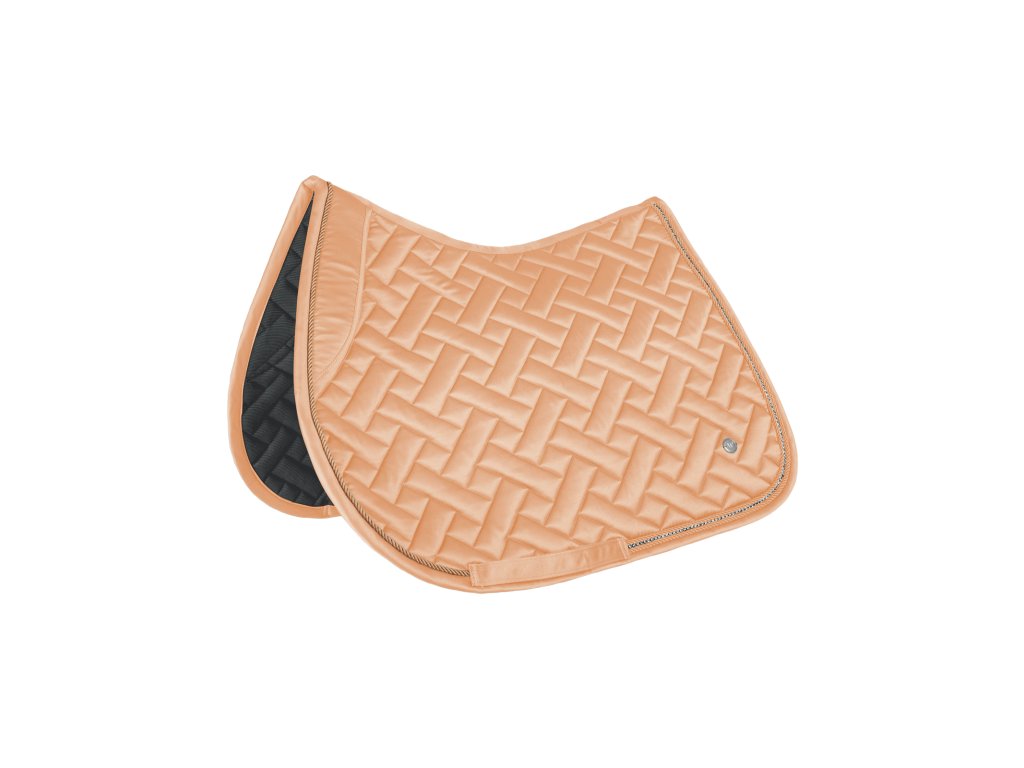 Luxusná všestranná podsedlová podložka Turin VSS v jemnom odtieni peach spája moderný dizajn s vysokou funkčnosťou. Vrchný materiál s elegantným leskom dopĺňa podšívka z bambusových a polyesterových vlákien, ktorá výborne reguluje vlhkosť a pomáha udržiavať chrbát koňa suchý aj počas intenzívneho tréningu.