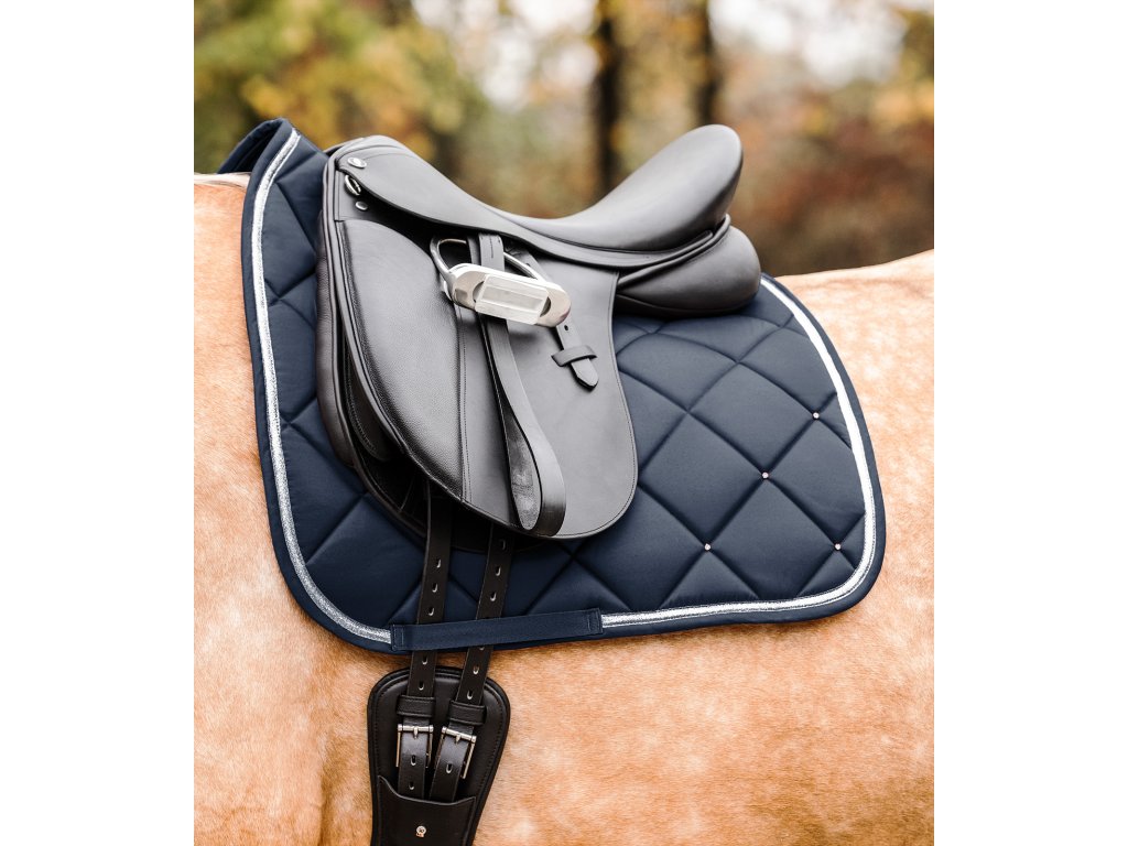 Podložka, ktorá nechá v aréne zažiariť vás aj koňa. Waldhausen Competition – drezúrna, farba Night Blue, spája trblietavý glitter lem a kamienky s premyslenou funkciou pre citlivý chrbát. Funkčná spodná strana dýcha a odvádza teplo, zatiaľ čo 8 mm pena a výplň 250 g/m² jemne rozkladajú tlak – kôň pracuje uvoľnene, sedlo drží stabilne a vy sa môžete sústrediť na každý detail jazdy.