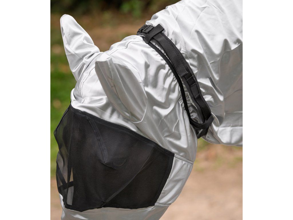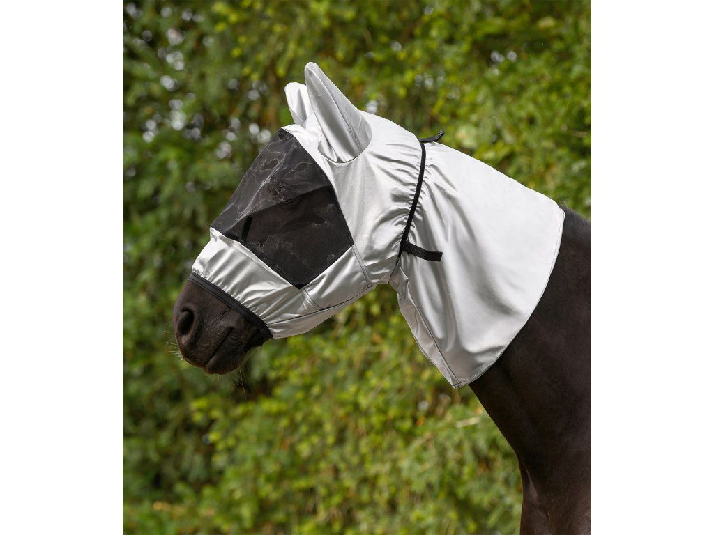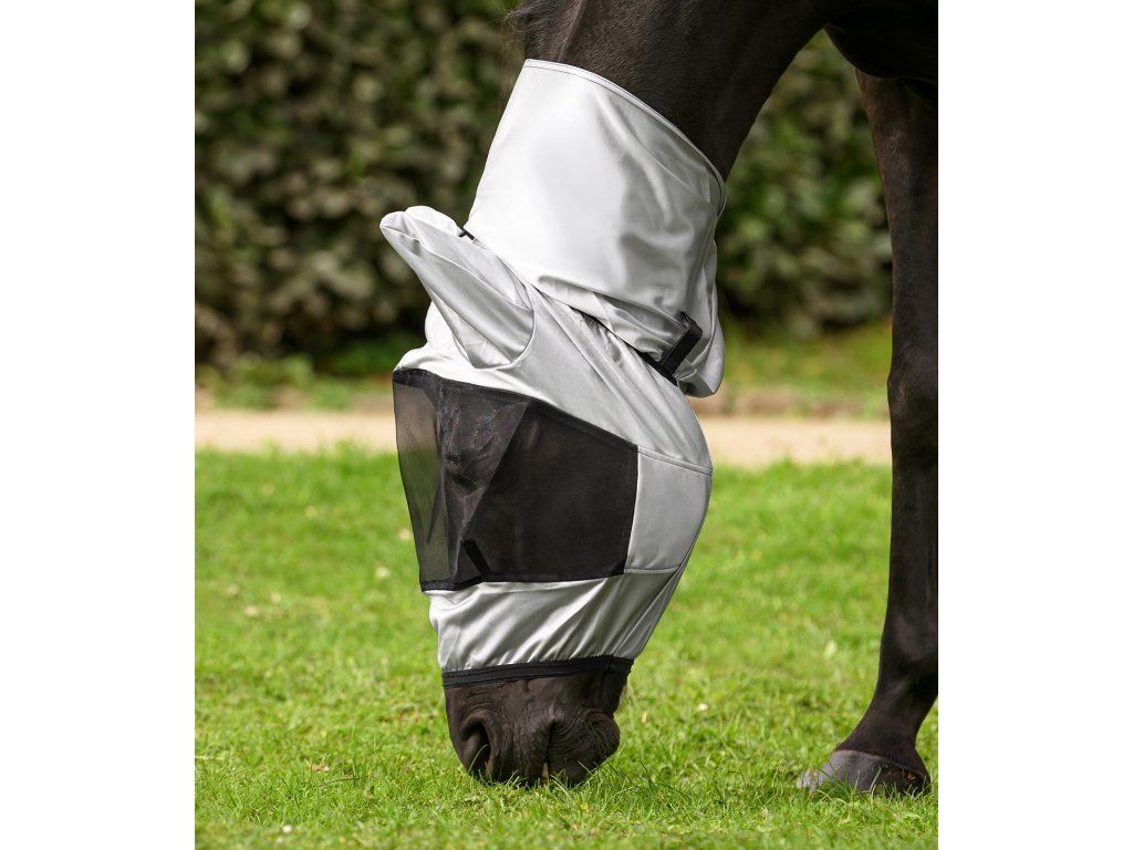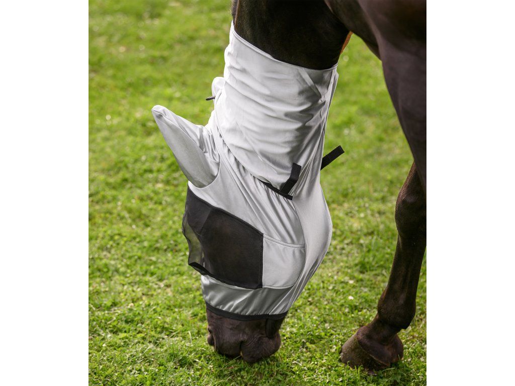 Veľká jemná sieťovaná vložka zabezpečuje jasné videnie a zároveň chráni citlivé oblasti hlavy pred muchami a iným hmyzom. Materiál zároveň poskytuje UV ochranu, čo je dôležité najmä pre kone s citlivou pokožkou alebo sklonom k ekzémom. Vďaka tomu je maska vhodná na dlhodobé nosenie aj počas slnečných dní.