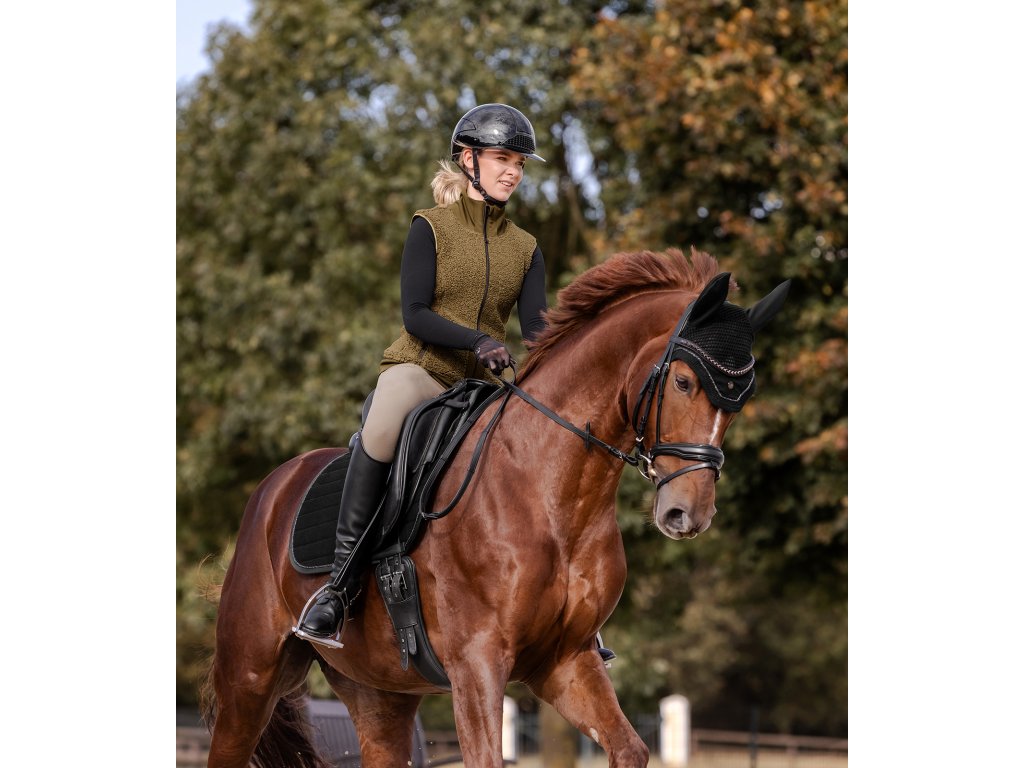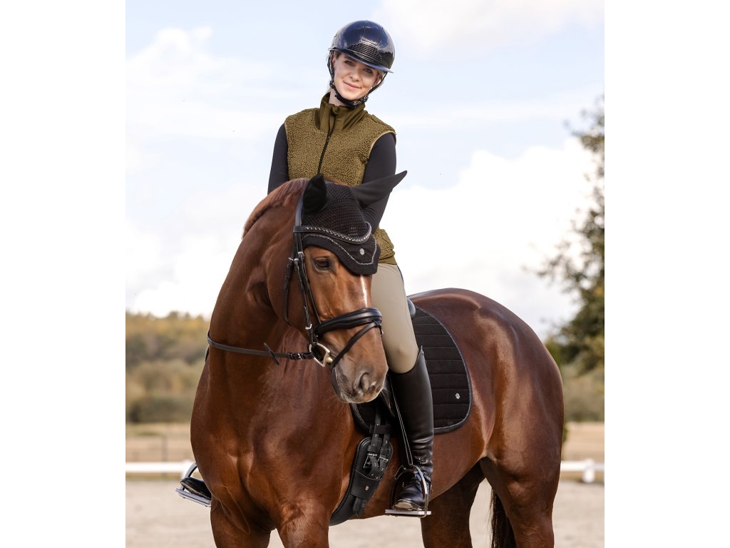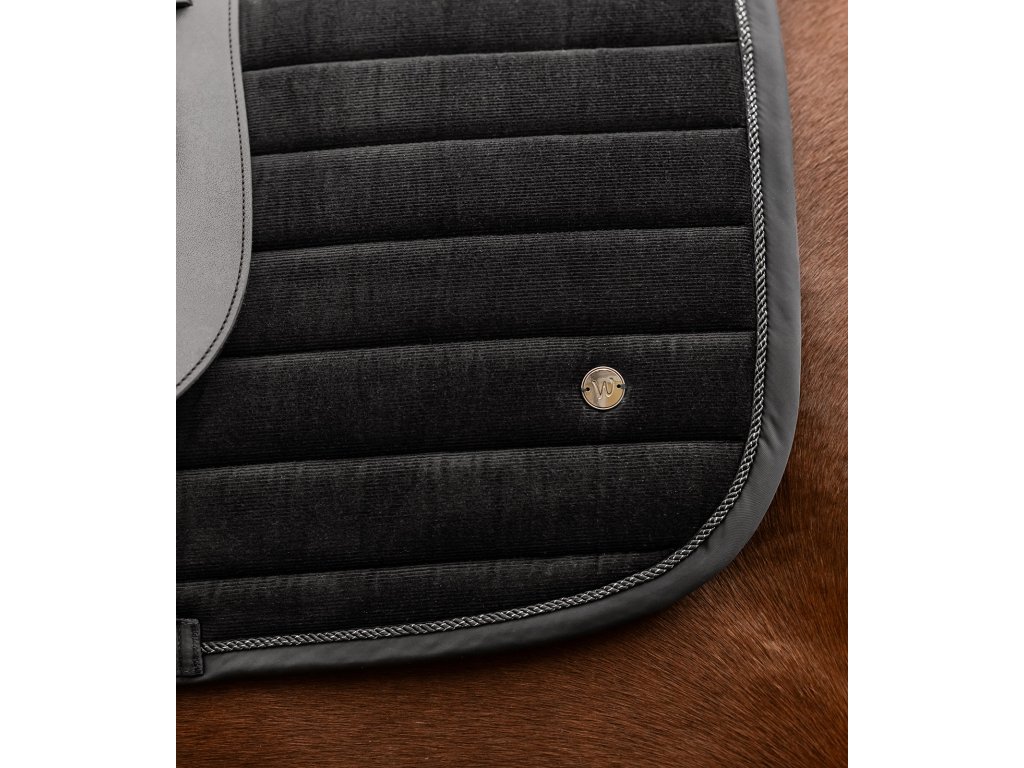 Čistá čierna, hladký kontakt, pokojný chrbát. Waldhausen St. Gallen – drezúrna podložka (Full) spája uľadený corduroy vzhľad so šmrncom trblietavej šnúry a antracitovej kovovej platničky. Vo vnútri pracuje 10 mm pena a výplň 300 g/m², ktoré rovnomerne rozkladajú tlak – kôň kráča uvoľnene a vy cítite istotu v každom kroku. Priedušná vnútorná strana odvádza teplo, odnímateľné suché zipsy a voľba jednodielnych alebo delených popruhov na podbrušník uľahčia používanie. Pocit? Elegantná istota na tréning aj do kolbiska.