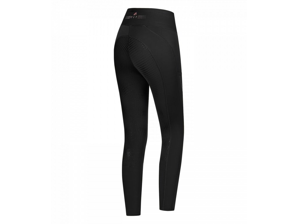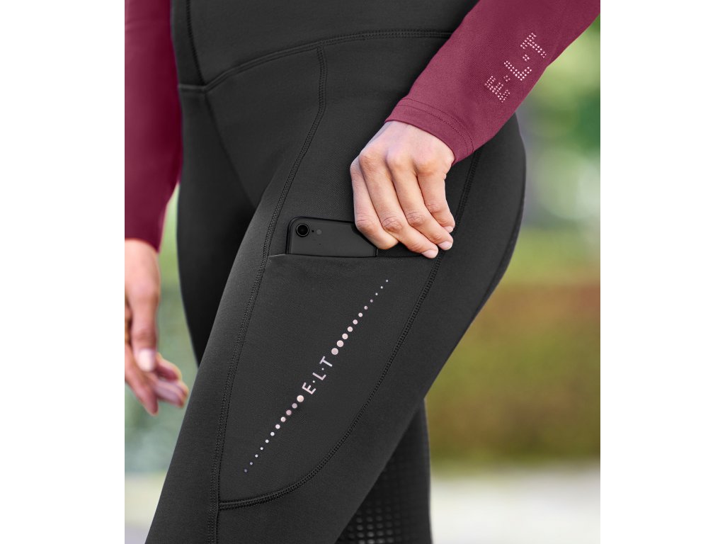 Použitý zateplený úplet so zdrsnenou vnútornou stranou vytvára príjemné teplo bez zníženia priedušnosti. Silikónová priľnavosť zabezpečuje stabilitu v sedle, zatiaľ čo bielastický syntetický materiál poskytuje voľnosť pohybu a komfort aj pri dlhšom nosení. Praktické dve zasúvacie vrecká na mobil s lesklou silikónovou potlačou a lesklý detail s logom E·L·T na zadnej časti pásu dodávajú legínam moderný, prémiový vzhľad.
